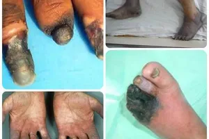 3. Местное лечение : антисептические повязки, обработка участков некроза 7–10 % раствором поливинилпирролидона. При инфицированной гангрене → антибиотики в/в согласно антибиотикограмме, дренирование абсцессов, высечение некротизированных инфицированных тканей. На изъязвления, после ликвидации инфекции → бинтовые повязки, смоченные в 0,9 % NaCl, возможно гидрогелевые повязки. Не следует использовать антибиотики местно, а также накладывать мази на участки некроза или изъязвлений.